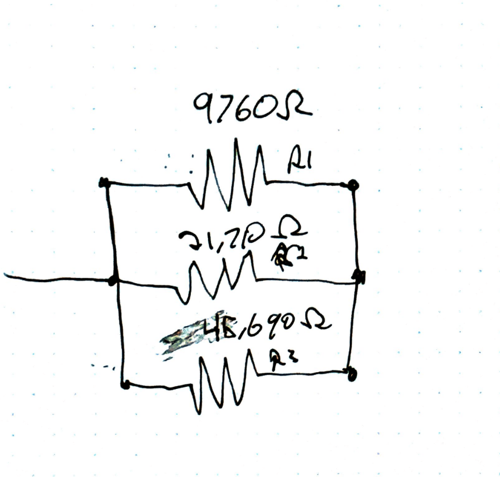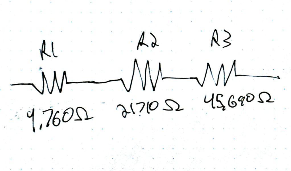 Calculations: R = 9,760 + 21,710 + 45,690 = 77,160 ohms